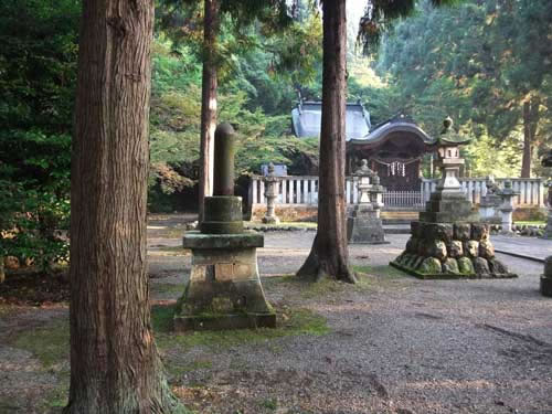 、朝日の差し込む本殿前