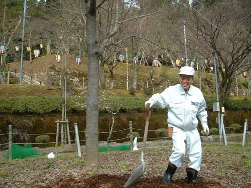 枝垂れ桜根元に大量のチップ撒き作業