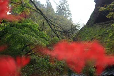 ふるさとの家、かやぶきと彼岸花