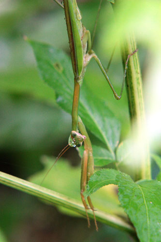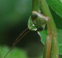 カマキリの頭に雫の帽子