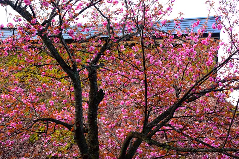 ふるさとの家かやぶき屋根をバックに八重桜満開