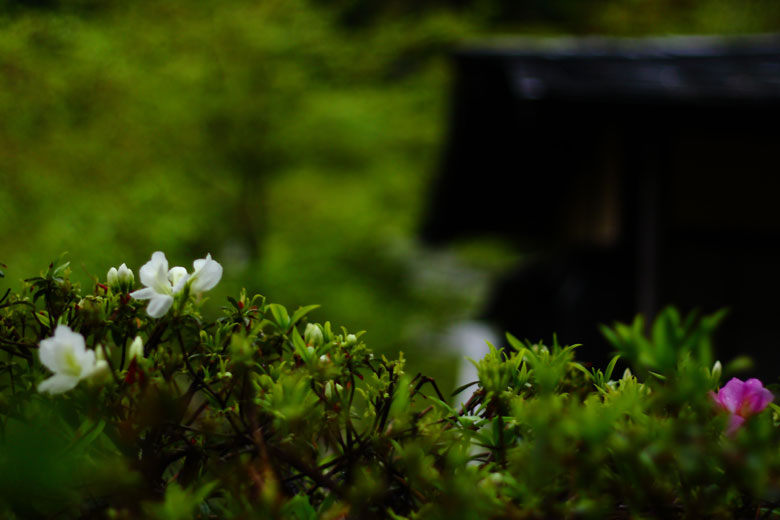 五月雨の中、ツツジの開花、山月楼前
