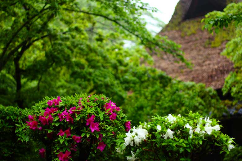 花筐公園ふるさとの家かやぶき屋根とつつじ、この後雨に