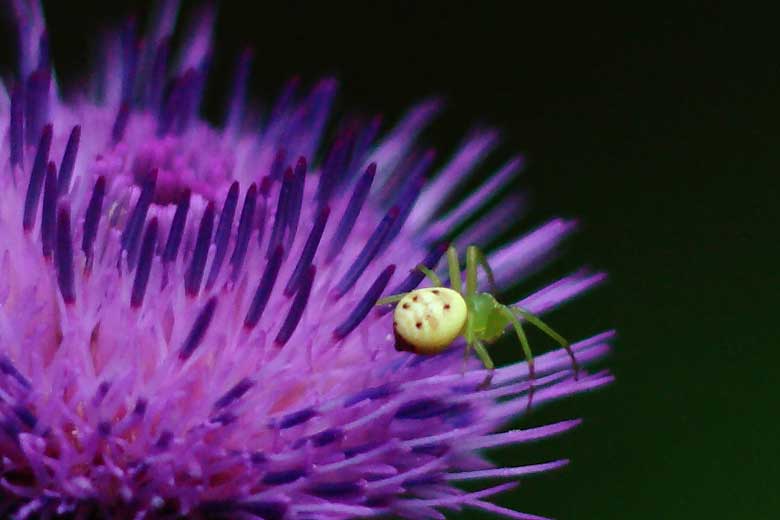 ノアザミに小さな白い球体、側で見ると何ともユニークなクモ、お腹が顔のように