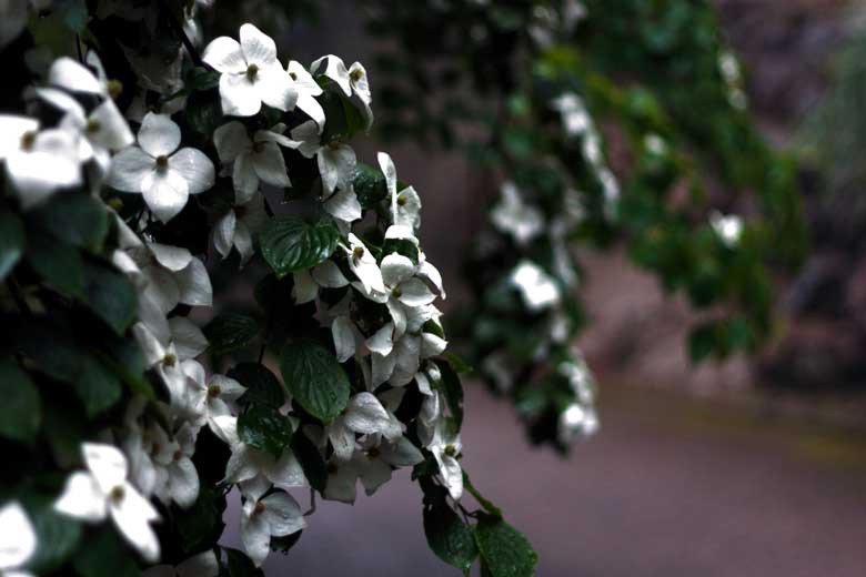山道へ張り出すヤマボウシ、その下を傘を差しくぐり抜けて歩く、「山法師 傘はいらぬと 白頭巾」