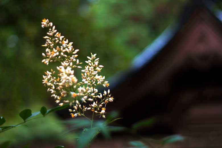 神社の破風のそりと南天の花がいかにもお似合い、小雨傘