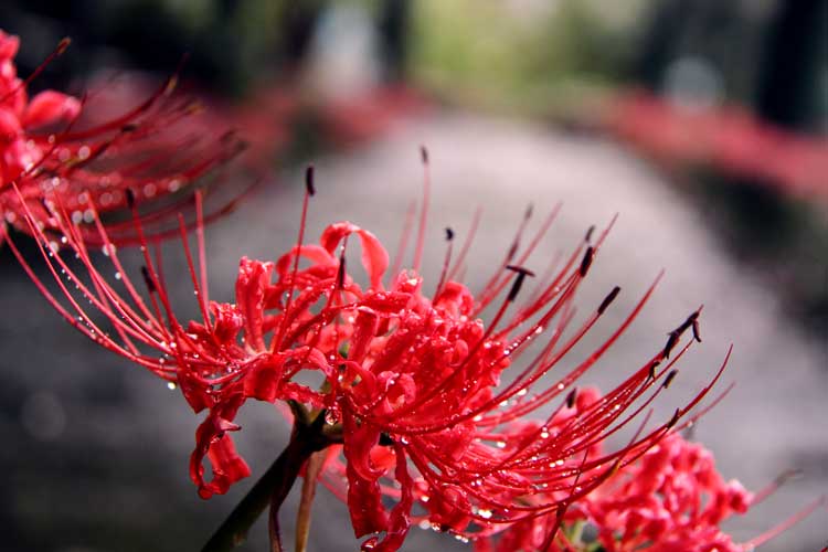 こんぴら参道の彼岸花、雨滴が引き立てる