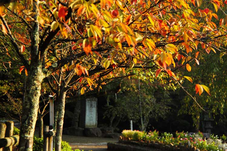 公園碑付近の桜、落葉準備で紅葉