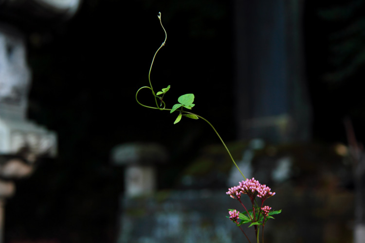 石碑の前、小花から伸びた一本の蔓(つる)