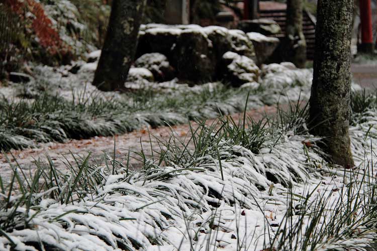 天皇誕生日、うっすら積雪のこんぴら参道登り口、緩やかに降雪中