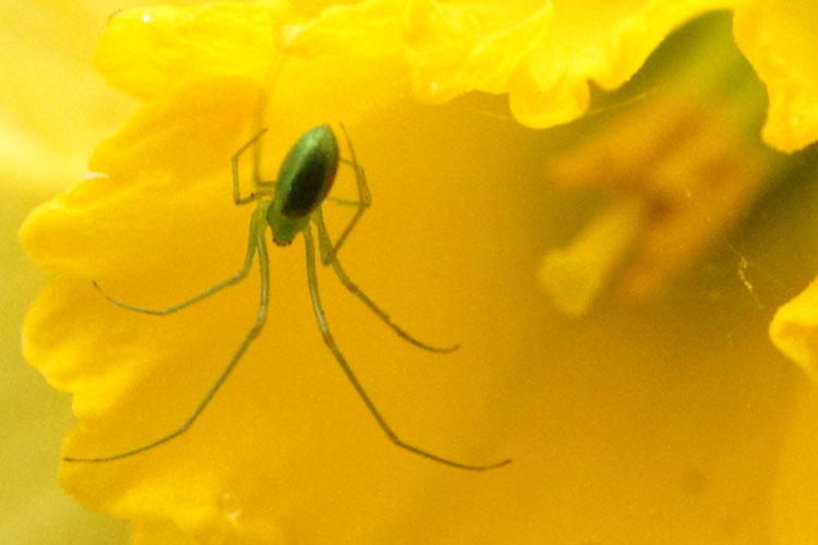 水仙の花の中で踊る青く綺麗なウロコアシナガグモ(5ミリほど)、忠魂碑参道