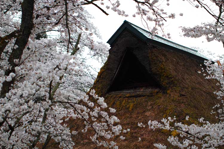 かやぶきの屋根に桜、暖か味と郷愁漂う牧歌的風景に心安らぐ