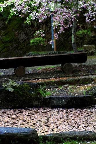 昨夜来の強風、一夜にして大半のソメイヨシノ散る、花びら浮かぶお泉水