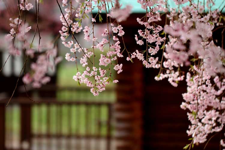 花筐公園駐車場にもなる姫公園、今八重と枝垂桜満開、背景に越前市商工会ログハウス