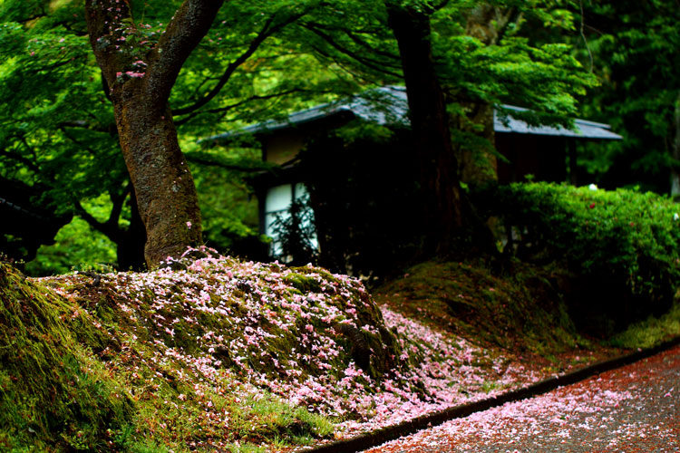 八重桜の散り姿はボリューム、立体感それに色彩もあって鮮やか、山月楼横