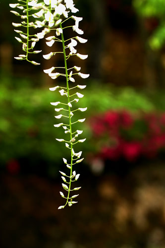 藤棚からフジの房、バックにつつじの赤、今年はまだ房が少なくハチの羽音も小さい