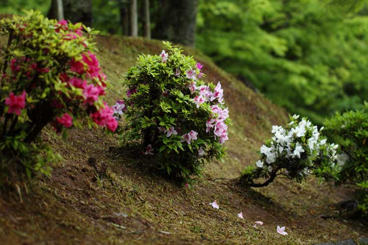 異なる3色のツツジが楽しめるアングル、少し散りだし