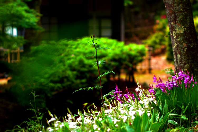 紫と白のシラン(紫蘭)開花始め、背景に山月楼