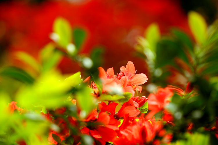 ヤマツツジの後ろに真赤なもみじ、忠魂碑横