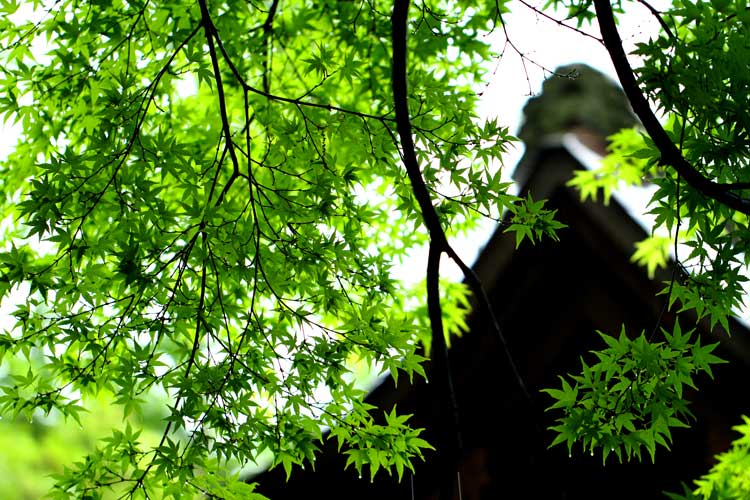 新緑に雨滴、今雷がなって雨、小さなお堂を背景に