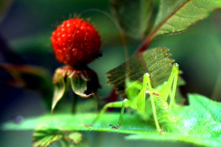 野いちごとバッタ、何か物語がありそうな雰囲気