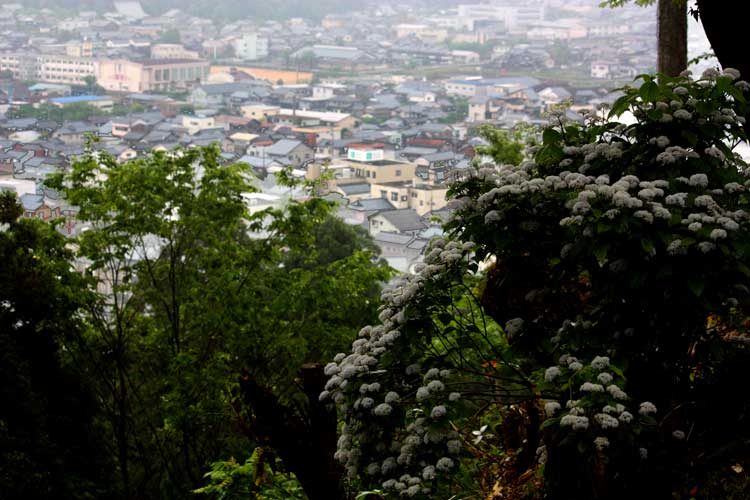 琴弾山コアジサイ、左上に岡本小学校の校舎と校庭