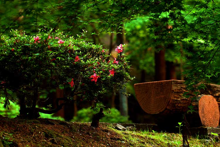 新緑の中、さつきとベンチ