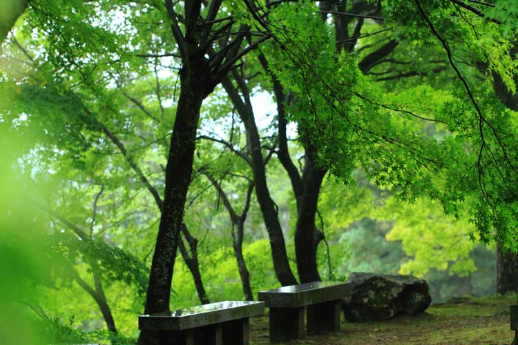 傘を差しながら、忠魂碑前、もみじ新緑、まもなく入梅か