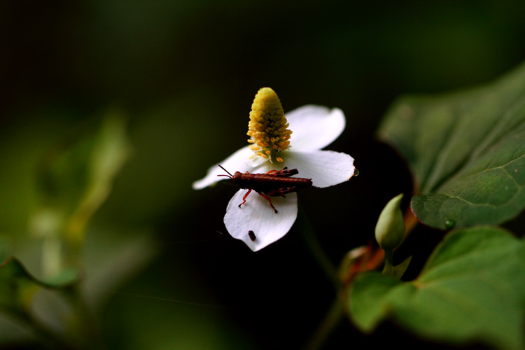 葉(総苞片)の上の昆虫に目がいき、手前の黒い粒も昆虫、日の丸構図ですが周りの雰囲気をそのままに