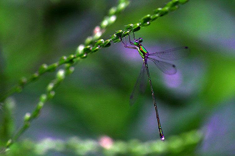 秋の野草につかまる糸トンボ、メタリックな色彩でモダン感覚