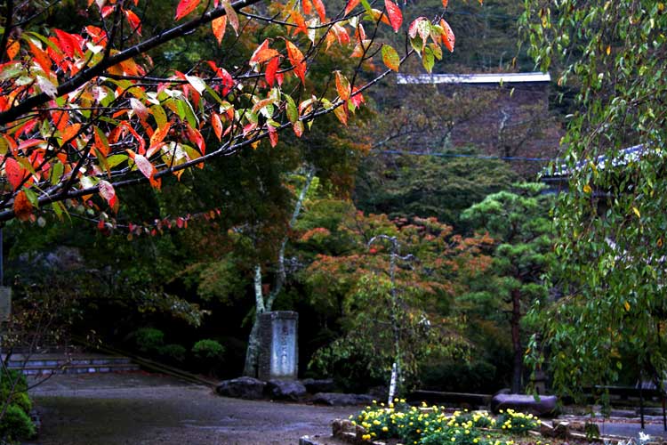 ふるさとの家のかやぶき、小雨降る中、紅葉が静かに始まった里の秋