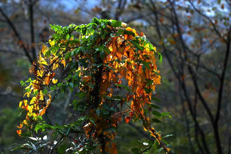 ハートマーク、むかごの葉の紅葉、雨滴に黄葉が冴える