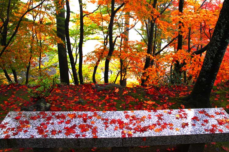 北陸屈指の紅葉スポット、忠魂碑前ベンチ、毎年お会いするカメラマンの方と談笑