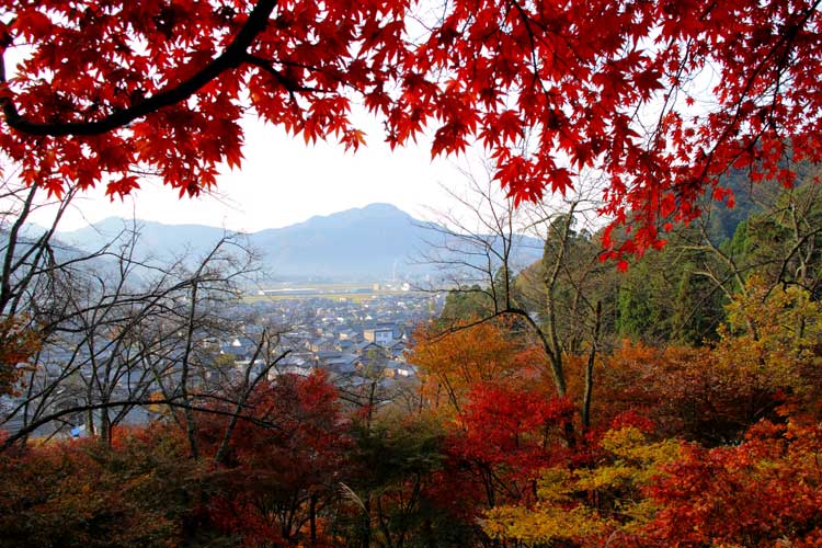 紅葉樹海の中、浮かぶ越前富士(日野山)のシルエット