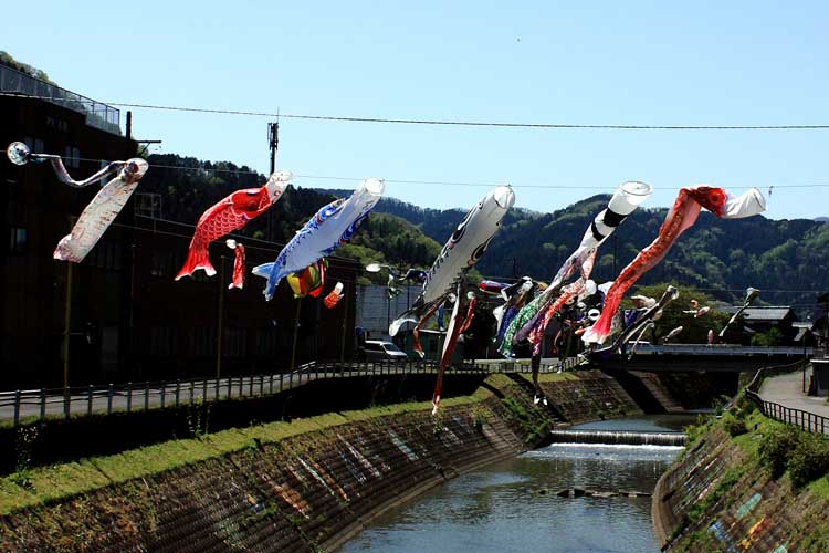 野岡、川の上に元気よく鯉のぼり