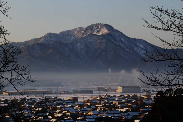 日野山と粟田部の住宅屋根に雪、強い冷気