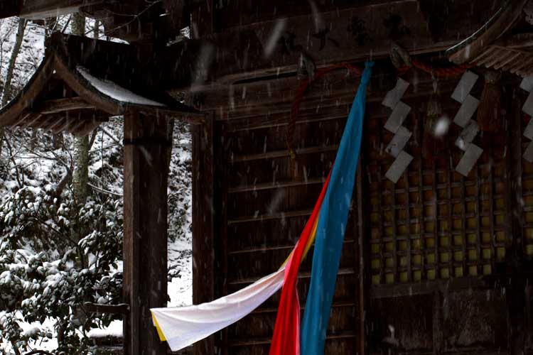 振る雪の中五色の布が鮮やか、出雲大社