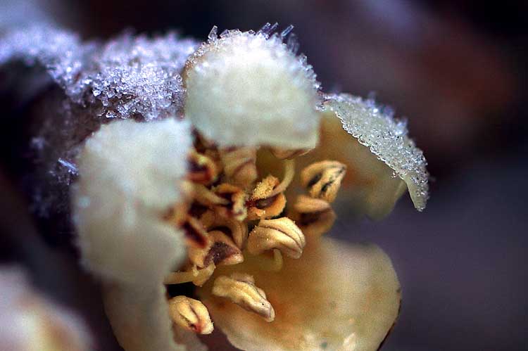 凍りついたビワの花、今朝の冷え込みようがよくわかる