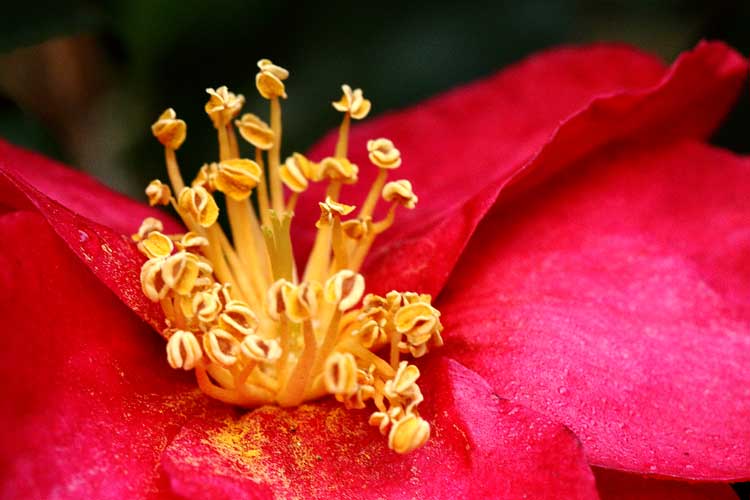 ツバキのおしべとめしべ、花粉も散って躍動感