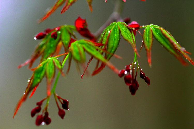もみじの若葉、まだ朝もや煙る小雨の中、傘の雨音ワルツ
