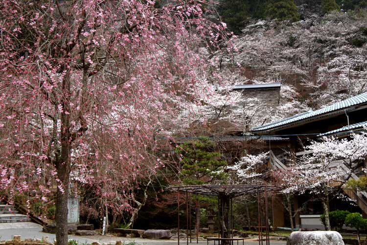 ふるさとの家かやぶきの周りも白くなってきました、桜四分咲き