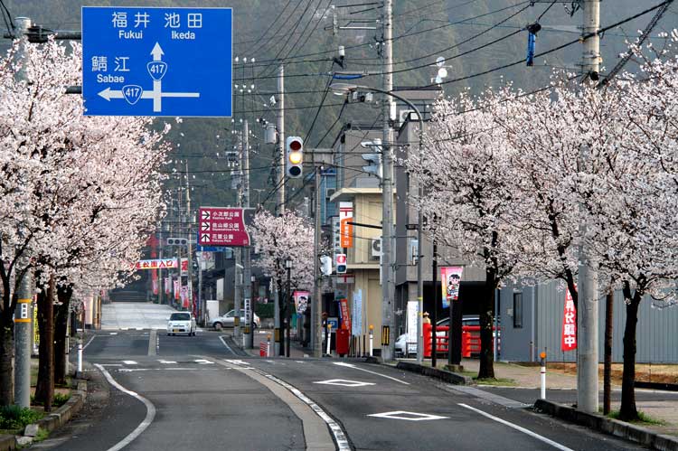 粟田部の街中桜並木、正面奥に岡太神社の鳥居と花筐公園入り口の大きなボンボリ