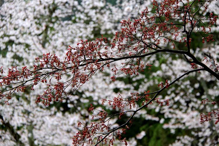 満開の桜を背景にモミジ葉の芽吹き鮮やか、花冷えか少し寒い