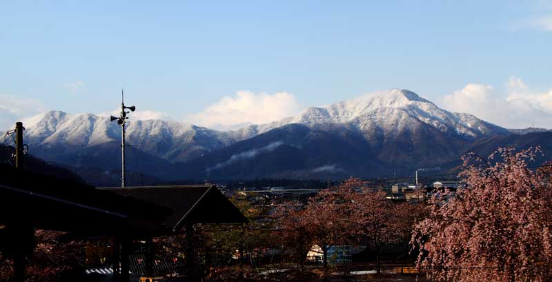冠雪もなるほどの先ほどまでみぞれ、越前富士(日野山) 右下に見ごろの花筐枝垂桜