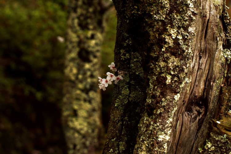 年輪を経た桜の古木から顔を出す小さな桜が好き