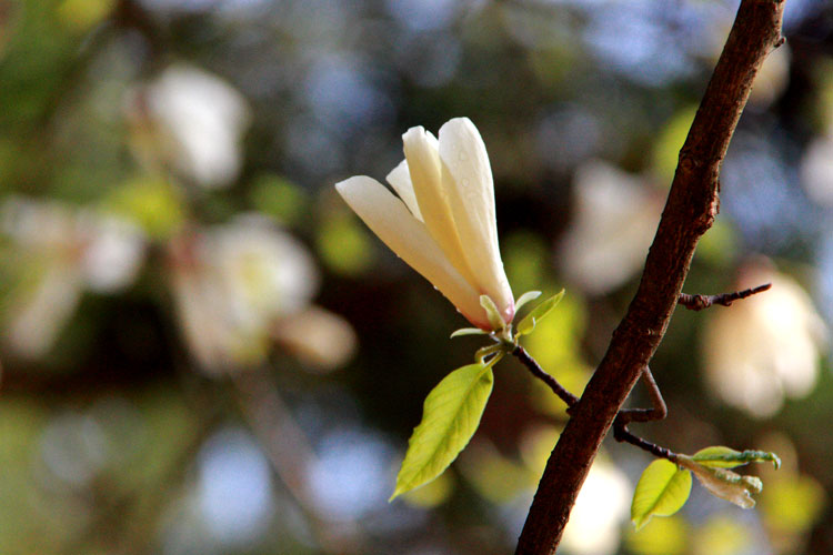柔らかいクリーム色のコブシの花、満開の木の下から上を見上げると青空も見えて綺麗