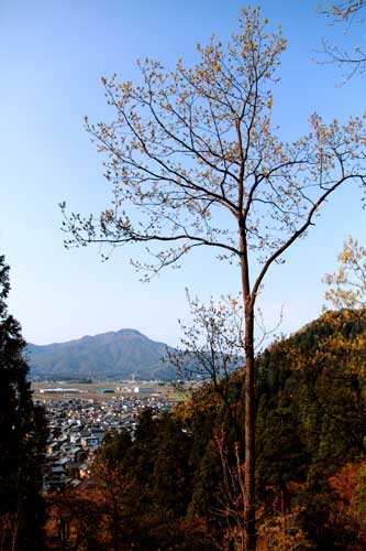 この〜木何の木、気になる木〜♪、小さい黄色の葉?が遠くからも目立つ、背景に越前富士