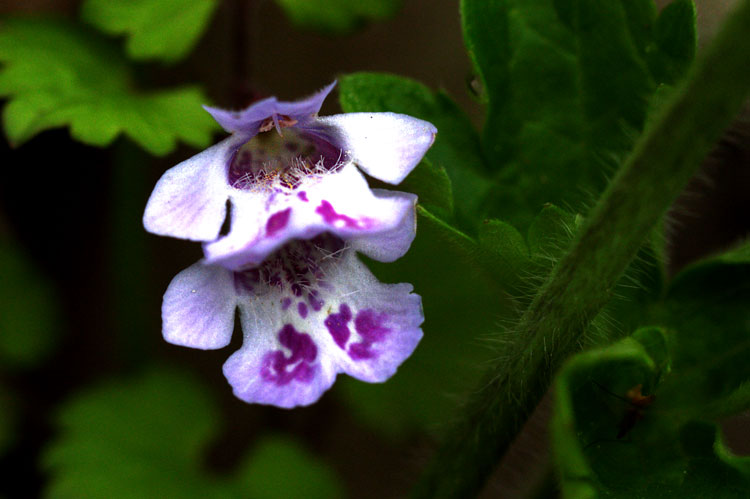垣根を越えて広がるところから垣通し、おもしろい形態をしているカキドオシの花