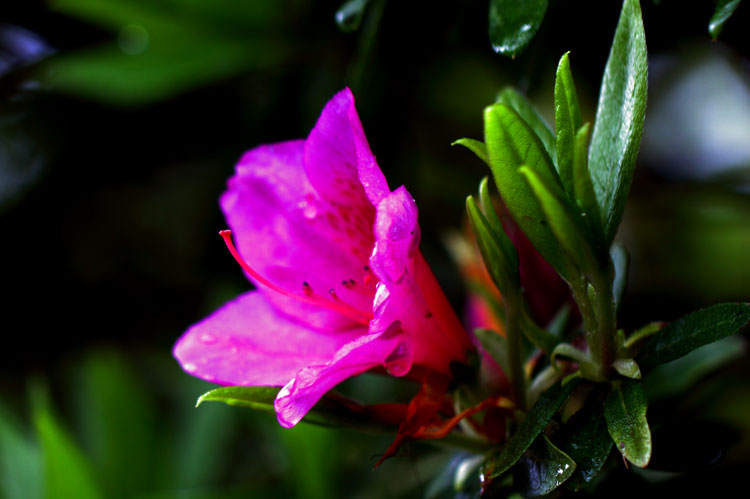 一番ツツジ開花、昨日ボンボリとりはずし、裸電球のみ残る静かなたたずまい、傘を差しながらサンデーモーニング