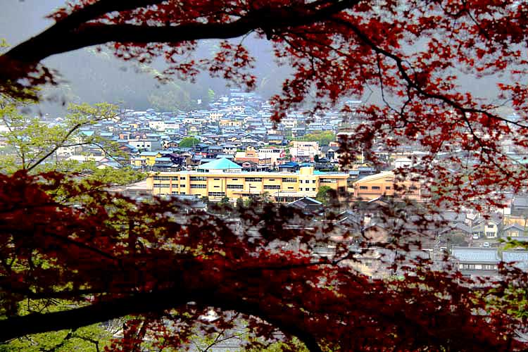 春もみじ紅葉、花筐小学校と粟田部、奥の扇状地形には岡本の町並みも、この直後雨が降り出し退散